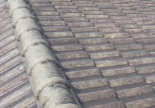●《屋根》コンクリート瓦(モニエル瓦) カラースラリー層が風化し、防水効果が無くなり、かび や藻が発生している状態です。経年劣化は避けられない ものです。コンクリート系の屋根は一般的に10年前後 が「塗り替え」の目安とされています。 | ![]() |